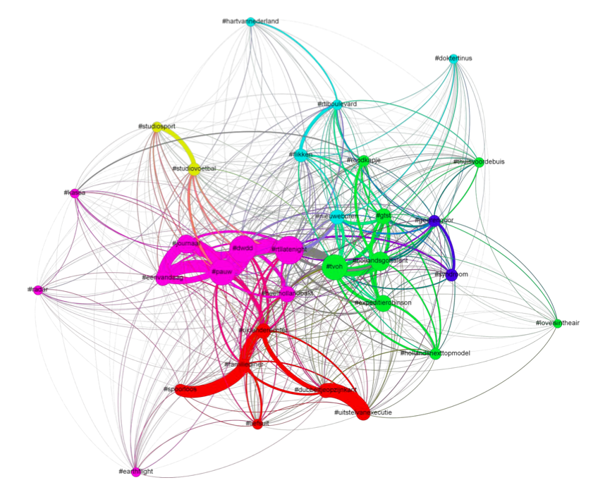 De kans dat iemand na RTL Boulevard over een NPO-programma twittert is klein, terwijl de kans dat er na Boulevard over een SBS-programma getwitterd wordt, groter is. Opvallend is de centrale rol voor Heel Holland Bakt, waar alle ‘lagen van de Twitter-samenleving’ samenkomen. Er ontstaan diverse clusters, die weergegeven zijn door de verschillende kleuren.