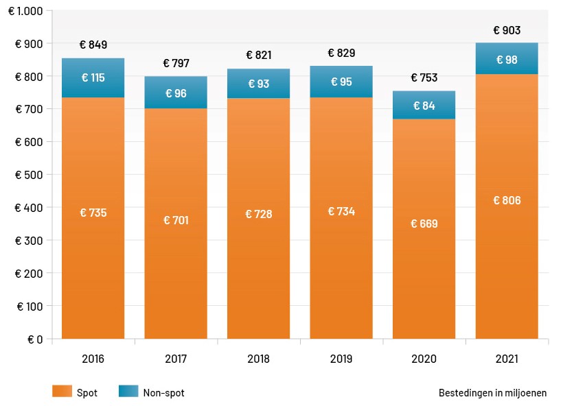 De non-spotbestedingen zijn in 2021 uitgekomen op € 98 miljoen. Deze vorm van advertising laat een groei zien van maar liefst 16,6%. Hiermee komen de non-spotbestedingen boven het niveau van vóór de coronacrisis uit.