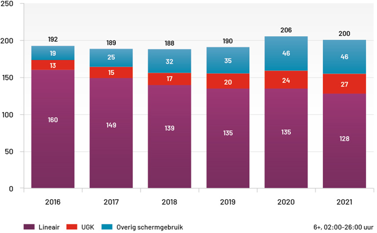 De daling in kijktijd, van 206 minuten in 2020 naar 200 minuten in 2021 (-3%), is veroorzaakt doordat we minder live zijn gaan kijken (-5%). Hier tegenover staat dat we meer uitgesteld zijn gaan kijken (+13%). Het overig schermgebruik is gelijk gebleven op 46 minuten per dag.