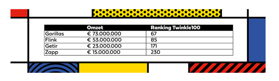 In 2021 werd er op het gebied van e-commerce weinig nieuws zo breed uitgemeten in de media als de opkomst van flitsbezorgers. Gorillas, Flink, Getir en Zapp* streden in 2021 om wie het snelst marktaandeel kon veroveren. Alle vier maken voor het eerst hun opwachting in de Twinkle100, maar slechts twee haalden de top-100: Gorillas staat op 67 en Flink op 85.