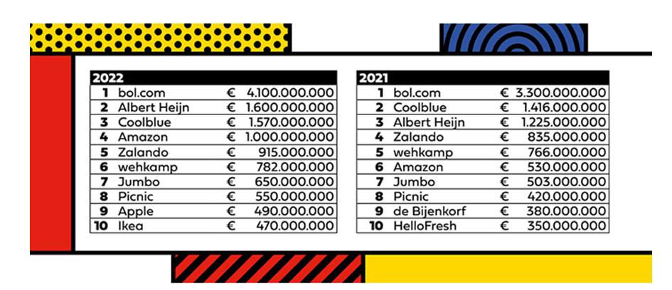 Ook Jumbo en Picnic groeien en behouden posities 7 en 8. Amazon staat dit jaar op de vierde plaats in de lijst; de online gigant zag naar schatting 1 miljard euro op het platform omgaan. Zalando en wehkamp zakken beide een positie. Apple en Ikea maken de top-10 compleet.