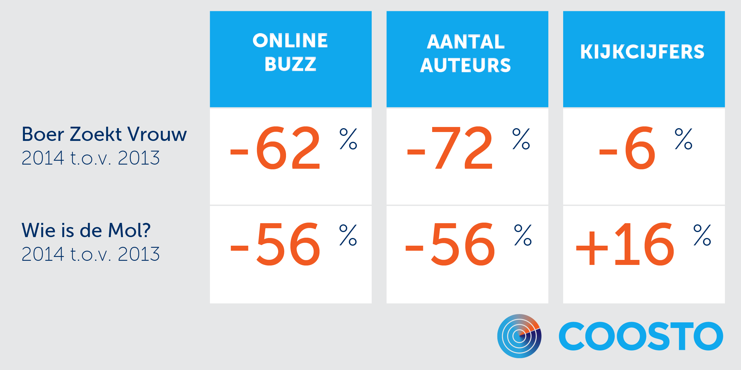 Ik schreef eerder al over een afname bij Boer Zoekt Vrouw, Wie Is De Mol? en Eurovisie Songfestival. De afnames zijn niet mals. Voor ESF geldt dat het meevalt, ongetwijfeld vanwege het Nederlandse succes (buzz-afname 2014 ten opzichte van 2013: 35% in de halve finale en 19% in de finale). Voor de populaire tv-programma’s #BZV en #WIDM is de afname extremer: