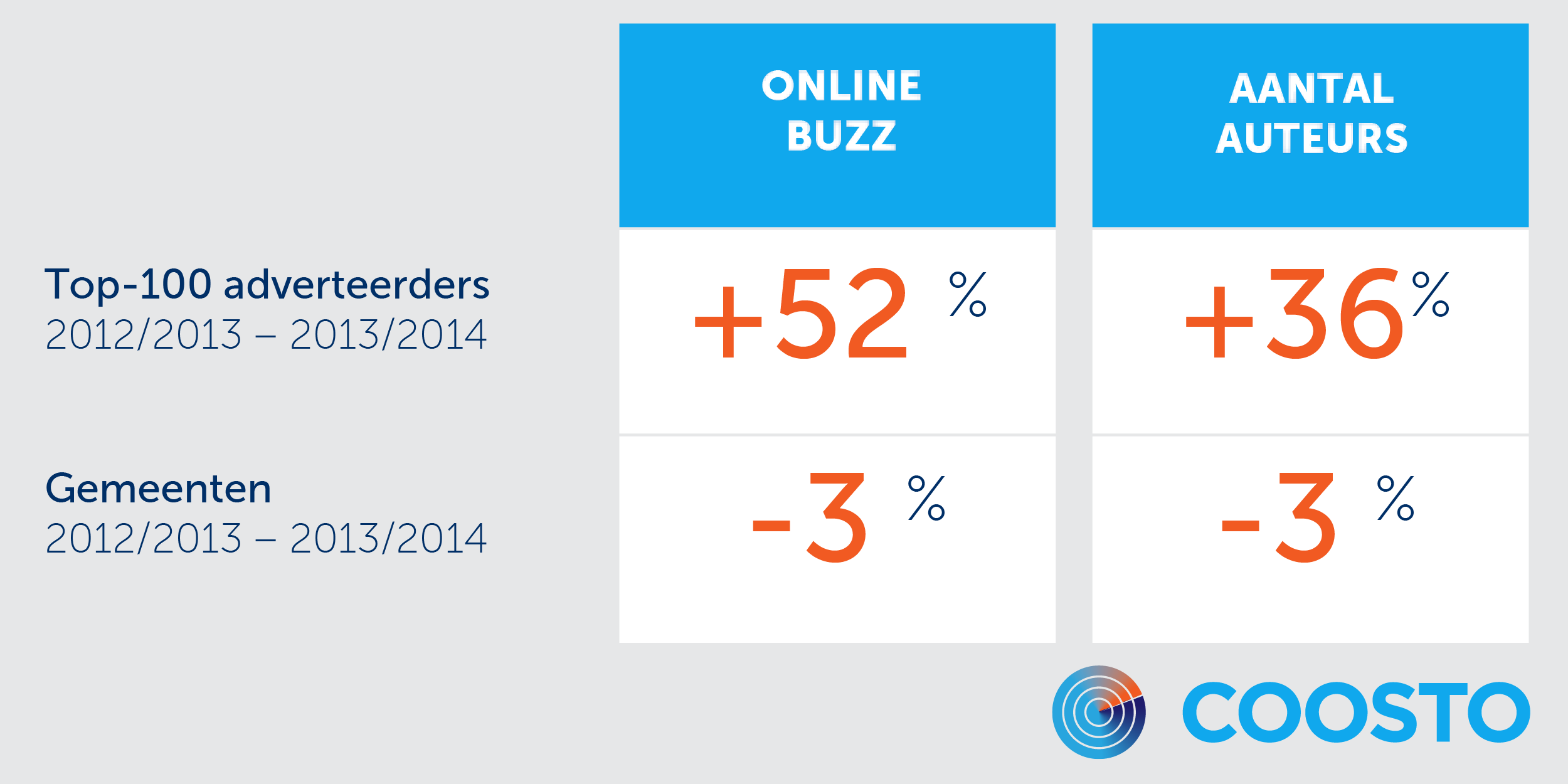 Bij merken zie ik juist dat het aantal berichten op Twitter enorm toeneemt. Als ik kijk naar de Top-100 adverteerders, zie ik een buzz-toename van ruim 50 procent. Dat toont direct aan waarom er zoveel ongeloof was bij veel bedrijven met betrekking tot de Twitter-afname: hun webcare-activiteit neemt namelijk gemiddeld toe met 52 procent (!). Bij berichten over gemeenten is een lichte afname zichtbaar, maar ook lang niet zo extreem als de algemene tendens.
