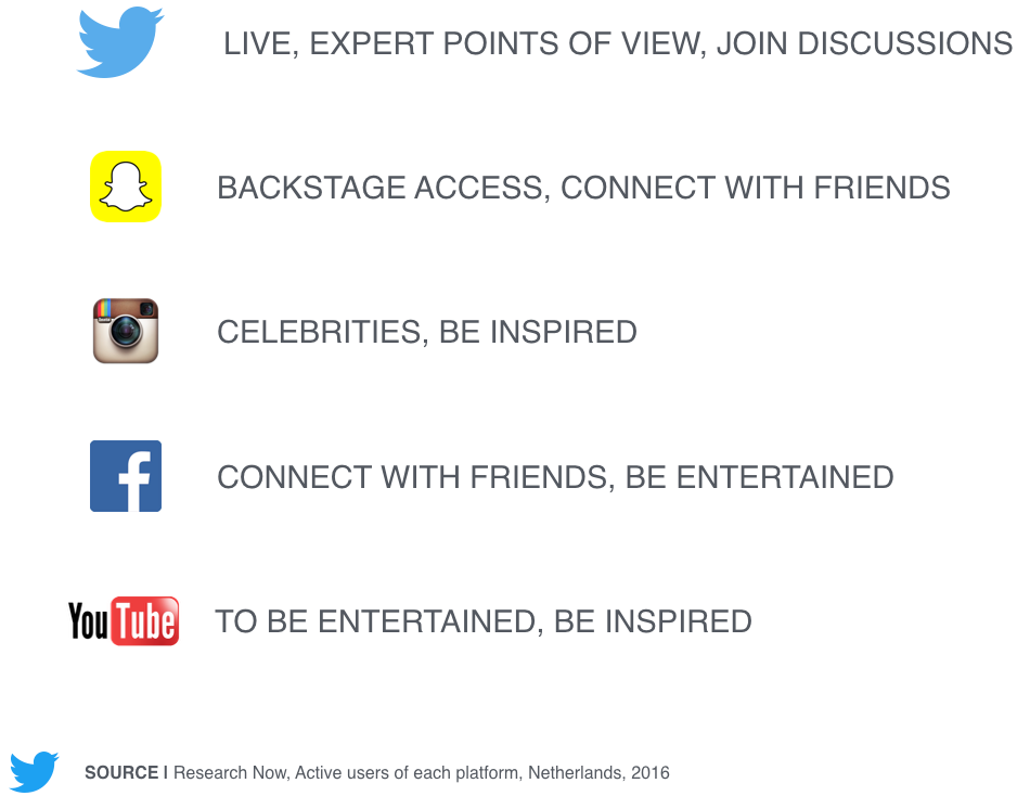Volgens Research Now, Active users of each platform (Twitter NL, 2016) worden over het algemeen de meeste sociale media kanalen gebruikt om te connecten met vrienden, entertainment en het volgen van beroemdheden. Twitter wordt echter gezien als het kanaal waar gebruikers up-to-date blijven en waar gebruikers kunnen discussiëren over de laatste gebeurtenissen en trends.
