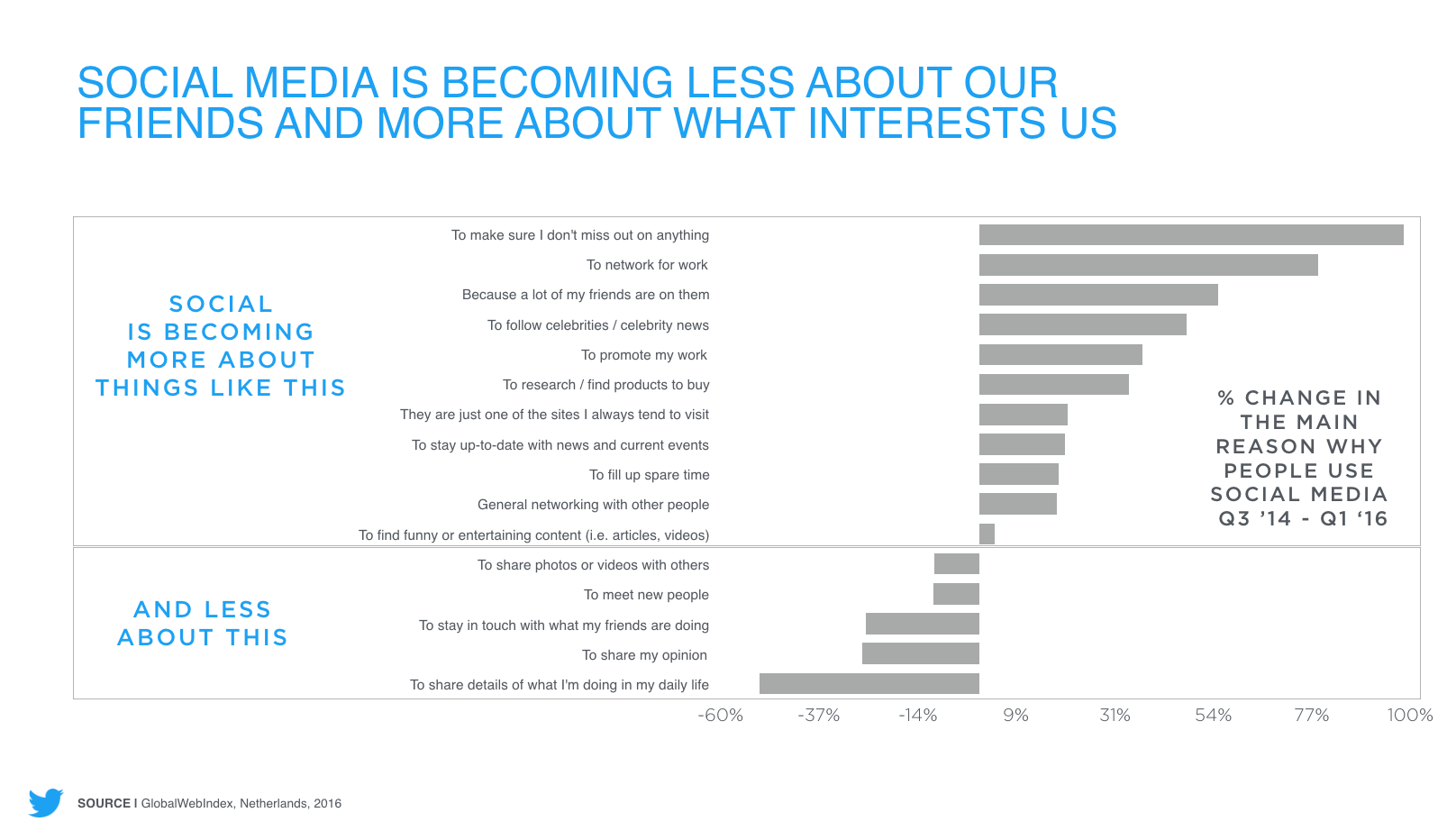 Dit duit op het nog meer volwassen worden van het social media landschap. Hierdoor bedient elk kanaal zijn eigen doelgroep, die op hun beurt het kanaal voor specifieke redenen bezoeken en gebruiken. Zo worden de unieke eigenschappen van elk platform benadrukt. Twitter valt hierbij op door haar gebruikers met een ‘expert points of view’, Dit biedt interessante kansen voor merken.