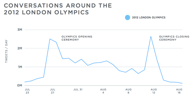 Wanneer we kijken naar de Olympische Spelen van 2012 ten opzichte van 2016 kunnen we een explosieve groei verwachten. In totaal werden er meer dan 150 miljoen Tweets gestuurd tijdens de Spelen van London. Alleen al tijdens de openingsceremonie waren er 9,66 miljoen verstuurde Tweets. Alleen het woord “gold” werd al in meer dan 9,86 miljoen Tweets genoemd. Het is dan ook niet verwonderlijk dat twee jaar later tijdens de Winterspelen 97 procent van alle Nederlandse Olympiërs actief was op Twitter. In datzelfde jaar, tijdens het WK in Rio, werd de kracht van Twitter en live sport extra duidelijk met meer dan 672 miljoen verstuurde Tweets.