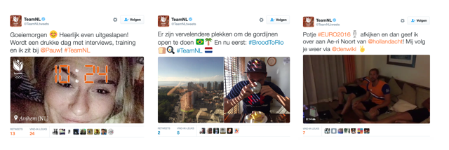Elke dag krijgt een nieuwe olympiër het beheer over het @TeamNL account. Er is een vast patroon te zien, met bijvoorbeeld elke dag een ochtendfoto van de sporter in bed. Er worden gemiddeld zo’n vijf Tweets per dag verstuurd die met name bestaan uit foto’s en korte video’s.