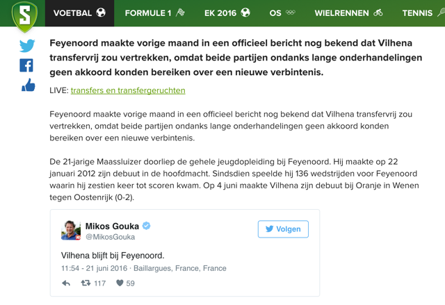 Twitter en sport zijn onlosmakelijk aan elkaar verbonden. Elke zomer wordt dit weer bevestigd tijdens de grote toernooien, maar zeker ook tijdens de transferperiode in het voetbal. Fans zitten dagenlang #’s af te struinen naar de laatste geruchten. En niet alleen de fans, ook de nieuwssites halen tegenwoordig hun breaking news steeds vaker van Twitter. Zoals in dit voorbeeld waar bekend werd dat Tonny Vilhena zijn contract had verlengd bij Feyenoord: