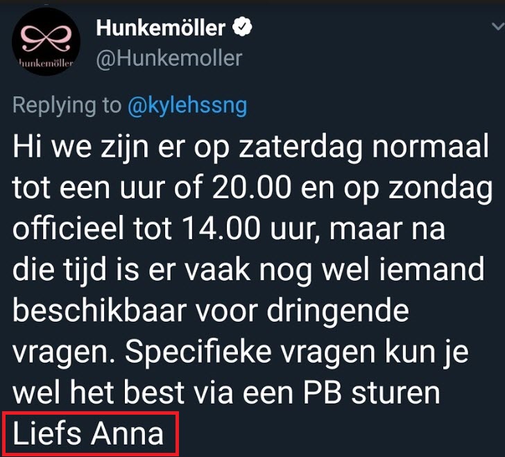 - Pas je tone-of-voice aan op de doelgroep die je bedient en op de uitstraling van je merk. Ga niet uitgebreide vousvoyeren als je met jongeren communiceert, maar ga zeker ook geen popie-jopie taal gebruiken bij klanten van een oudere generatie. Tip: zorg voor afsluitingen in berichten die bij je merk passen. De afsluiting in dit voorbeeld van Hunkemöller is natuurlijk helemaal prima: