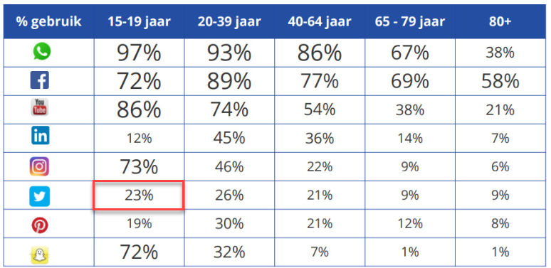 Met mijn 34 jaar behoor ik echter niet meer helemaal tot de groep der jongeren en mijn standpunt komt mede daardoor niet overeen met de stand van zaken. Het Twitter-gebruik is namelijk 8 procent toegenomen en deze groei zit met name bij jongeren. Momenteel behoort bijna een kwart van de Twitter-gebruikers in Nederland tot de groep 15 tot 19 jaar.