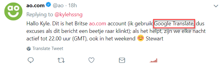 Gebruik idealiter geen Google Translate of andere vertaaltools. Bied support aan in de taal van je klanten. Dit geldt zowel voor internationale bedrijven actief in Nederland, maar natuurlijk ook andersom. AO biedt geen Nederlandstalige support en lost dit op met Google Translate. Dat ze hier open en eerlijk over communiceren is sterk, maar het doet wel een beetje afbreuk aan het merk en de snelle reactietijd (43 minuten). Verder is het de vraag of voor iedere Nederlander duidelijk is wat 22.00 uur GMT inhoudt?