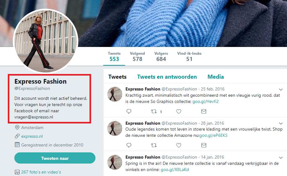 Verder valt het op dat er bedrijven uit de Twinkle 100 zijn die wel een Twitterkanaal hebben, maar er bewust niet op reageren, zoals dit voorbeeld van Expresso Fashion: