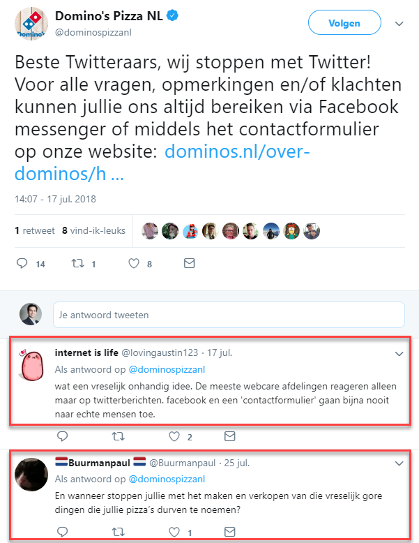 Er zijn echter veel valkuilen en Twitter is niet een kanaal dat je er ‘even bij kunt doen’. Maak goede keuzes welke social media-kanalen je minimaal wilt gebruiken voor webcare en neem Twitter hierin mee – zeker als dit aansluit bij je product of doelgroep. Zorg er voor dat je dit intern op de rit krijgt qua kennis en kunde, reactiesnelheid en openingstijden. Mocht je hier over twijfelen, maar wil je Twitter wel graag gebruiken als webcare-kanaal? Ga dan op zoek naar een partner die ten eerste de kennis in huis heeft en ten tweede ook goede openingstijden kan faciliteren.