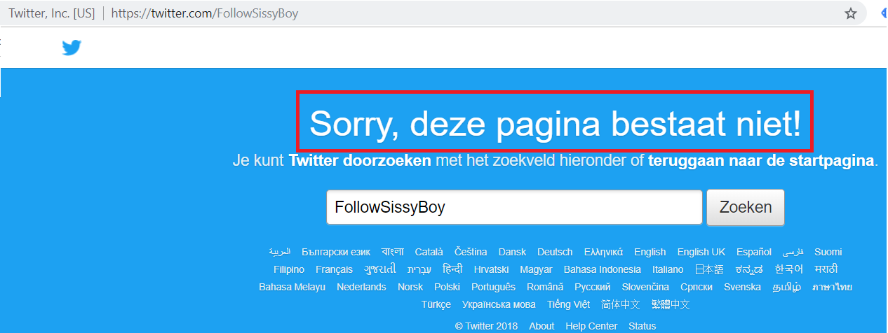 Wie echter op deze button klikt, krijgt de melding dat het Twitter-account niet (meer) bestaat.