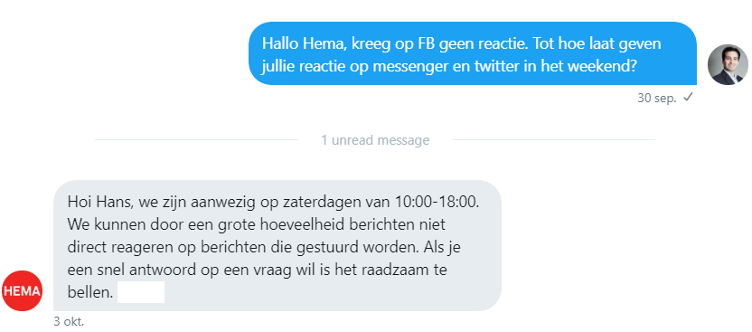 Een ander voorbeeld van een niet goed ingerichte webcare is die van Hema – recentelijk nog één van de Webshop Award-winnaars. Het bedrijf raadt aan om zowel Messenger als Twitter niet te gebruiken, maar om te bellen: