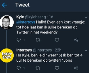 Is het dan zo slecht gesteld met Twitter-webcare van de Twinkle 100? Gezien de eerdere voorbeelden en cijfers uit het onderzoek, valt er inderdaad nog een hoop te verbeteren. Gelukkig zijn er een aantal lichtende voorbeelden. Uit ons onderzoek kwam een top-twaalf naar voren van bedrijven die binnen één uur reageerden in het weekend. Daarnaast zijn al deze bedrijven bereikbaar op zaterdag en zondag via Twitter. Veel bedrijven hebben ook ruime openingstijden, sommige tot zelfs middernacht: