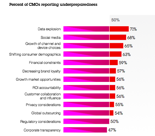 71% van de CMO’s geeft aan dat ze niet weten hoe ze moeten omgaan met de data ‘explosure’: de hoeveelheid data en informatie over de klanten die voorhanden is gekomen. De marketeers worstelen met de Big Data en zijn onvoorbereid om daar optimaal gebruik van te maken. 69% van de CMO’s uit de Benelux heeft moeite met het inzetten van social media (engagement, luisteren en een dialoog opstarten). Voor hen ligt het voor de hand om deze taken als eerste aan de PR-afdeling te geven en over te gaan op het reguleren of controleren door regels en richtlijnen op te stellen. En dat terwijl de kracht van het gebruik van social media juist zit in het opstarten van een dialoog en het faciliteren van de communicatie.