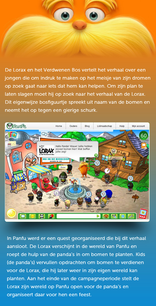 Voor de promotie van De Lorax en het Verdwenen Bos werd een quest georganiseerd waaraan kids konden deelnemen. De verhaallijn die werd bedacht, sloot zowel aan bij de inhoud van de film als bij de wereld van Panfu (zie screenshots). Dit betekent dus dat er een volledige integratie plaatsvond van advertentieboodschap en advertentie-omgeving. Content werd hierdoor relevant voor de gebruikers.