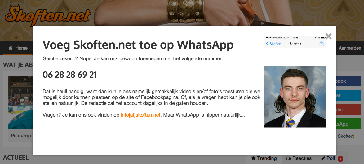 Wat het idee inhield? De mannen van Skoften vragen hun fans en bezoekers om via WhatsApp content toe te sturen. Zelfgemaakte foto’s of video’s of tips van andersmans werk is van harte welkom. “We hadden altijd in de website de mogelijkheid daartoe, in de vorm van een formulier”, legt Brinkman uit. “Maar dat is in de afgelopen 2 jaar doodgebloed. Niemand neemt nog de moeite om een account te maken, filmpjes naar hun laptop te sturen en deze dan te uploaden via het formulier. Dat vinden ze veel te omslachtig.”