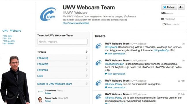 Waar in de klantenservice-industrie nog wel eens wordt getwijfeld over omvang en impact van social klantcontact, daar is UWV heel duidelijk: webcare is de klantenservice van de toekomst. Hoewel de activiteiten nog relatief bescheiden in omvang zijn (275 maandelijkse interventies door vier medewerkers), ligt de ambitielat hoog. Vanuit de one-to-many gedachte moet webcare een substantiële bijdrage gaan leveren aan de conversie van telefoonverkeer naar online, sociaal contact. Organisatorisch opereert webcare daarbij vanuit het Klant Contact Center en wel zodanig dat medewerkers telefoonwerk en webcare contact blenden.