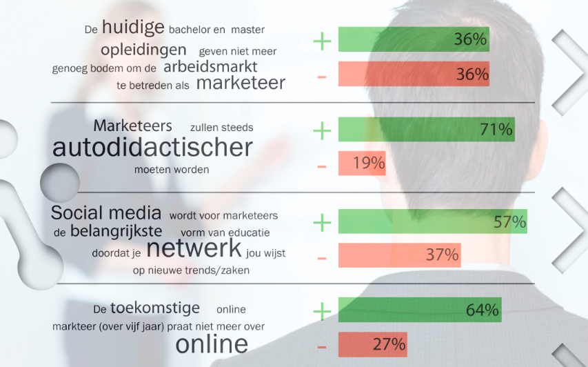 Om terug te komen op de vraag uit het intro – zal autodidactiek de conventionele educatie gaan vervangen? Daar zijn de respondenten het niet over eens. Geven de huidige bachelor- en masteropleidingen voor aankomende marketeers nog genoeg bodem om de arbeidsmarkt te betreden? De meningen zijn verdeeld. Ruim een derde geeft aan dat de huidige opleidingen niet meer voldoen. Een even grote groep respondenten is het met deze stelling oneens.