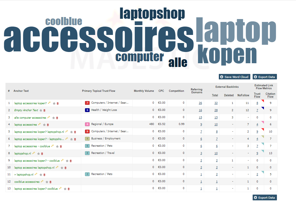 In de twee afbeeldingen kun je zien dat, mits je het hele thema van de website afstemt op één onderwerp, je zelfs met ‘ouderwetse’ linkbuildingtactieken topposities kun halen. Je kunt namelijk zien dat vrijwel alle links van startpagina’s afkomstig zijn en dat de anchorteksten op zijn minst spammy te noemen zijn.