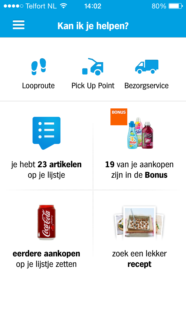 En hoe bekijk je het boodschappenlijstje, de looproute, je bestelgeschieden en producten die jij vaak koopt en die in de bonusaanbieding zijn? Via de AH-app natuurlijk! En voor wie geen 3G op zijn/haar telefoon heeft of gewoon voorkeur heeft voor wifi, biedt de AH in elke winkel gratis wifi aan. De app is bijzonder handig en biedt meerwaarde. Dat is de belangrijkste les voor websites en webshops. Een app ontwikkel je niet om erbij te horen, of omdat het leuk is. Een app moet écht meerwaarde bieden voor de gebruiker. Het gratis wifi wat de AH aanbiedt, is daarbij een overtreffende trap van service. Niemand die het zomaar verwacht of eist, maar de AH biedt het wel aan.