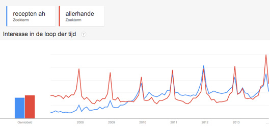 Albert Heijn heeft gekeken hoe het zijn klanten online nog beter kan helpen en meer mensen kan bereiken. Voedsel, aanbiedingen, acties en gerechten vormen de basis van de website. Met name het laatste is erg praktisch. Dat de online recepten een goed idee zijn, zal niemand verassen, maar het doet meer dan bezoekers helpen. De AH krijgt er ook steeds meer bezoekers mee op hun site en dat zijn potentiële klanten die in aanraking komen met het AH-assortiment. Met name in december, wanneer Nederland massaal op zoek gaat naar inspiratie voor het kerstdiner, zoals te zien in onderstaande zoekvolumegrafiek. Oftewel, door hun bezoekers te helpen op een manier die niet hun core business (levensmiddelen verkopen) is, zorgt de AH voor meer omzet.