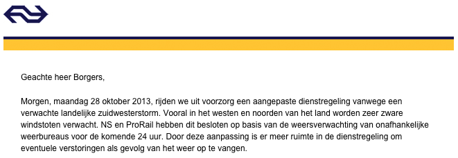 Een dienst als de NS gaat helaas gepaard met storingen. Dat kan niet volledig verholpen worden, maar dienstverlening daaromtrent wel. Denk aan updates bij ritinformatie en zelfs mailtjes wanneer op jouw traject een vertraging is of werkzaamheden plaatsvinden. De NS heeft zich in de loop van de jaren goed ontwikkelt en informeert pro-actief over problemen, zodat geanticipeerd kan worden. Een grote vooruitgang ten opzichte van gedwongen reageren op vervoersproblemen in het verleden.