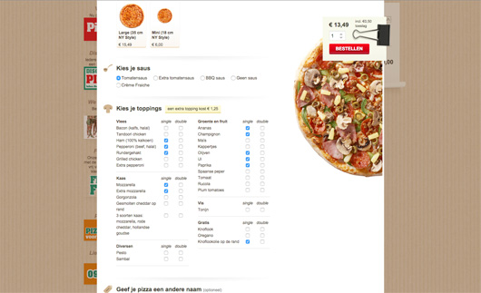Eten biedt ruimte voor beleving. Toon dus wat je aanbiedt en biedt mogelijkheden te finetunen. New York Pizza heeft dat uitstekend begrepen: zij bieden afbeeldingen van de producten en maatwerkaanpassingen. Zo biedt een grote restaurantketen met gestandaardiseerde producten toch maatwerk.
