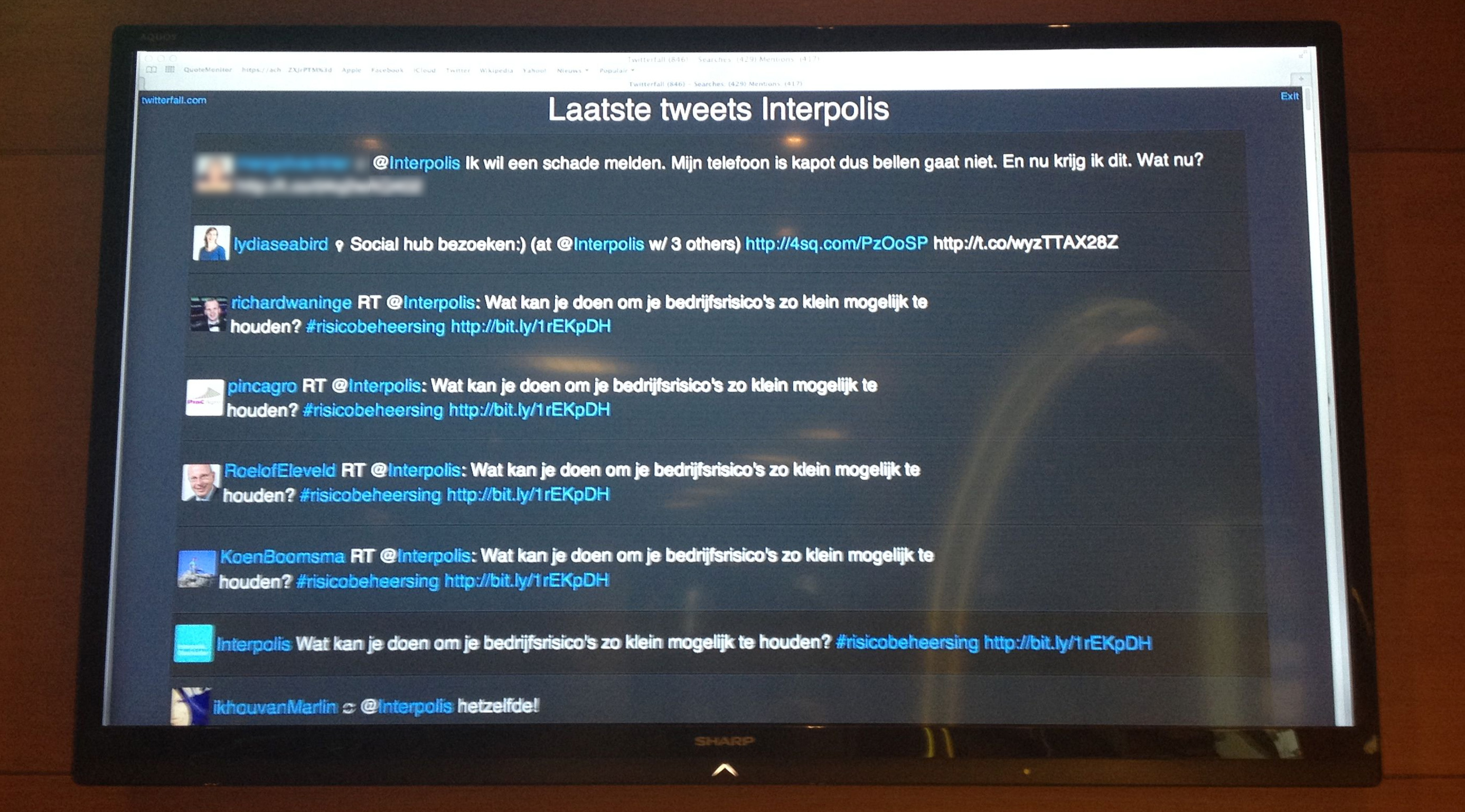 We gaan een rondje door het gebouw doen, waar we overal schermen tegenkomen met nieuws, afgewisseld door de laatste tweets die aan Interpolis zijn gericht. De tweets worden ongefilterd getoond. “Dat vinden we heel belangrijk,“ zegt David. “Buiten is binnen. We laten het zien zoals de klant het beleeft.” Zo wordt bewustzijn gecreëerd bij de medewerkers over de impact van social media.