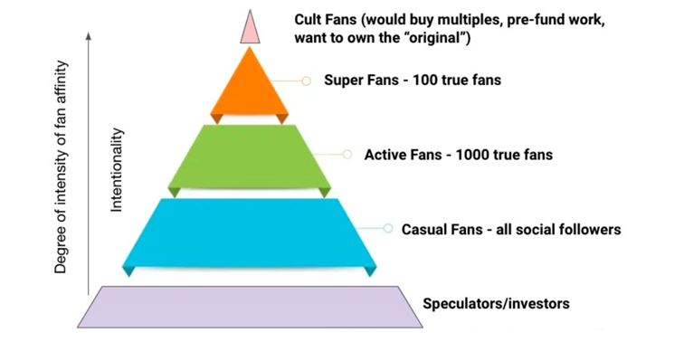Haar idee maakt Jin duidelijk aan de hand van onderstaand fan model. Het is een pyramide die inzichtelijk maakt hoe fans betalen voor de aandacht van de maker. Op het laagste niveau wordt gebruik gemaakt van standaardadvertenties, waarmee kijkers inkomsten genereren, zelfs als ze per ongeluk naar uw werk komen. In de laag daarboven bevinden zich de zogeheten affiliate links, waarmee fans met een kortingscode iets kunnen kopen dat door een influencer wordt aanbevolen. In de daarop volgende laag komen we in een subscriptie-model terecht, waarbij fans maandelijks een klein bedrag betalen voor bijvoorbeeld privé video’s op Onlyfans of een Substack-nieuwsbrief. Nog hoger zijn de op maat gemaakte merchandising- of social media-berichten voor superfans te vinden. Hierbij moet gedacht worden aan een persoonlijk voicemail die via Cameo gekocht kunnen worden. Op het allerhoogste niveau vinden we de fans terug die een extreem bedrag betalen, zoals bijvoorbeeld de koper van het werk Everyday van Beeple. Op dit niveau vinden we dus ook de NFT’s terug. Ze zijn een manier voor degenen met voldoende financiële middelen om de aandacht van een maker te trekken. Feitelijk koop je met een NFT de aandacht van de verkopende partij.