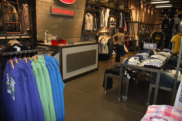 Rob de Bruyn gaf ons de tip om eens een kijkje te nemen bij Score Jeans. Deze winkelketen heeft in alle winkels bestelzuilen staan met alle producten van de website. In de winkel die wij bezochten vonden we de bestelzuil naast de kassa. Een weinig attractief apparaat, maar wel zeer effectief. Ook hier kan je, net als bij de WE Concept Store, je artikelen scannen, maar dit apparaat is wél ingericht op de consument. Zo kun je kijken of er nog andere maten of kleuren beschikbaar zijn en kan je direct online bestellen. Ook handig: je kan kiezen of je online of gewoon aan de kassa wil betalen.