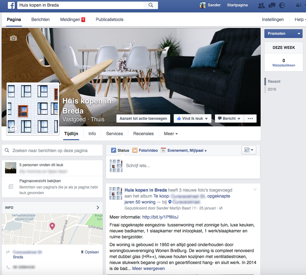 Al vrij snel nadat het huis op Funda stond, kwam bij mij het idee op Facebook-advertising in te zetten om de juiste mensen naar mijn pagina op Funda toe te leiden. Voor het opzetten van een Facebook-campagne heb je echter een Facebook-pagina nodig en gek genoeg was de naam ‘huis kopen in Breda’ nog vrij. En laat mijn huis nou net in Breda staan en die zoekterm mij erg aanspreken.