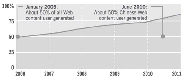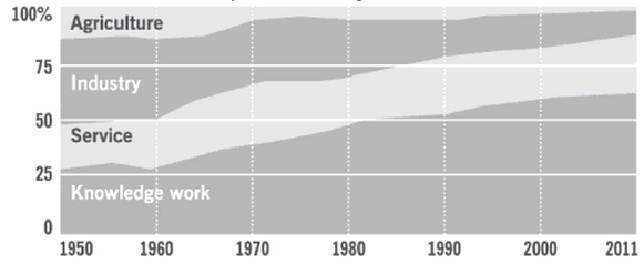Er zijn steeds meer aanwijzingen dat het hiërarchische model lang niet altijd optimaal is. Ons werk uit bestaat uit een steeds groter deel kenniswerk en dus uit (digitale) informatie (zie figuur hierboven). Directe communicatie en het delen van informatie maken samenwerking over grenzen eenvoudiger. Door de explosie aan informatie (zie figuur hieronder) en de mogelijkheden van sociale filtering krijgt iedereen toegang tot de juiste informatie om beslissingen te nemen in plaats van primair het management. De hogere transparantie (digitale monitoring) maakt het werk en resultaat beter meetbaar.