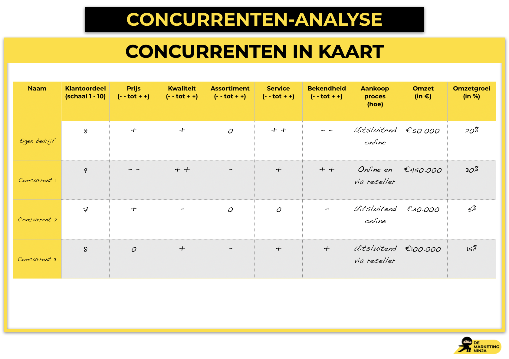 Om je eigen onderscheidende vermogen te herkennen, kan het helpen je te vergelijken met een paar concurrenten. Gebruik daarvoor bijvoorbeeld het schema van de concurrenten-analyse (zie afbeelding). Vergelijk concurrenten met jouw bedrijf en druk het uit in cijfers of plussen en minnen: wat bieden zij? Hoe bieden zij dit aan? En hoe worden zij beoordeeld door hun klanten? Door het zo concreet mogelijk te maken, overzie je waarin jij uitblinkt. En dat helpt bij het overbrengen aan je klanten middels je marketinguitingen.