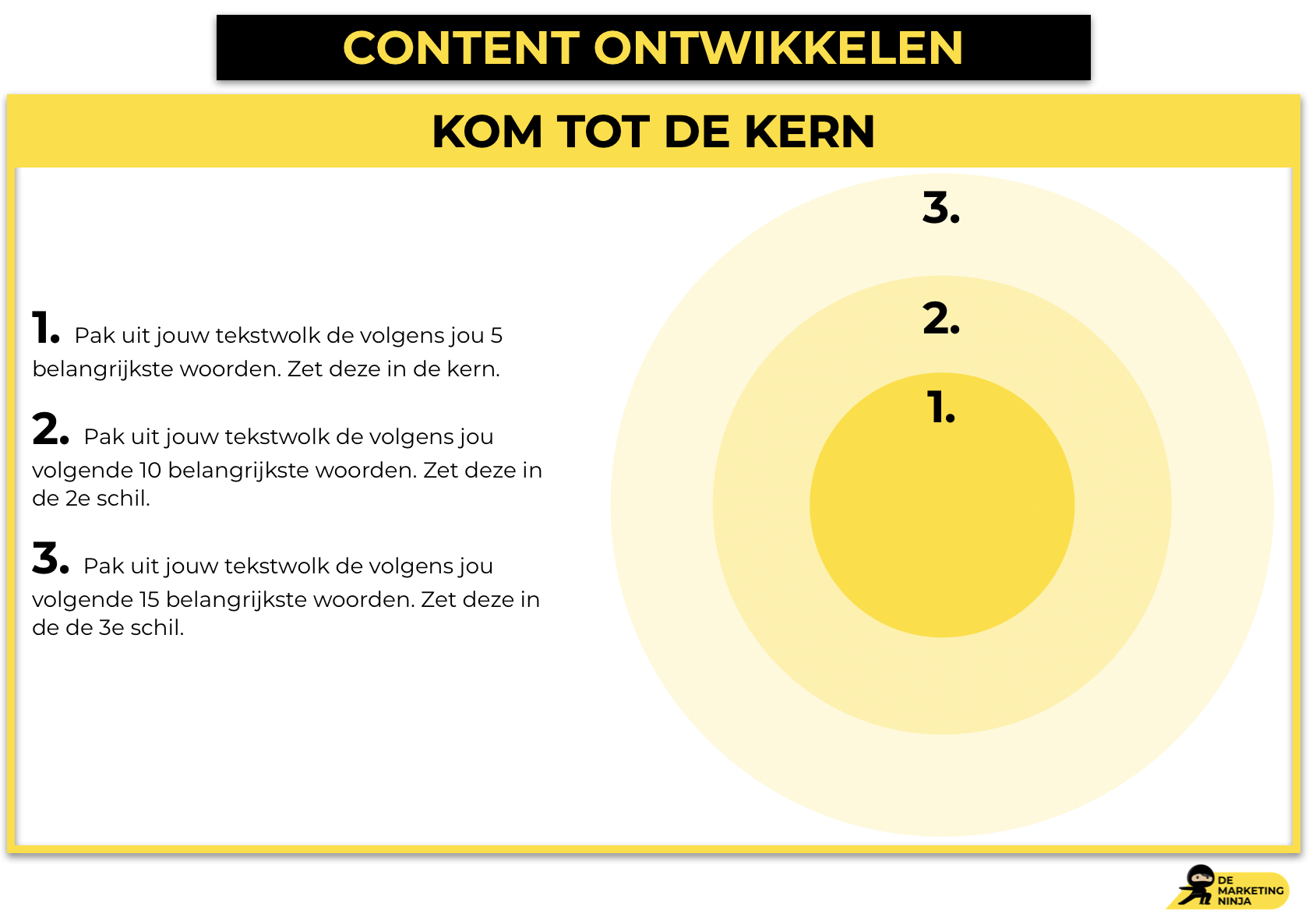 Een vaak gemaakte fout in marketinguitingen is dat men teveel boodschappen wil overbrengen. Er is natuurlijk een heleboel te vertellen. Je wil je doelgroep op een leuke manier aanspreken, uitleggen wat je te bieden hebt, hoe die klant dat moet inzetten en ook nog eens een goed aanbod doen. In de praktijk kom je erachter dat het niet mogelijk is om alles te vertellen in die ene marketinguiting. Daarom moet je keuzes maken en focussen op wat je op dat moment aan wie wil vertellen. Vraag jezelf daarom af: Als ik één ding mag overbrengen, wat moet dat dan zijn en aan wie? Schrijf eerst alles wat in je op komt bij je bedrijf en product of dienst, om daarna juist te schrappen en terug te gaan naar de kern (zie afbeeldingen hieronder). Zo kom je tot de dingen die er echt toe doen. Dit is de essentie van waaruit je je marketinguiting opbouwt.