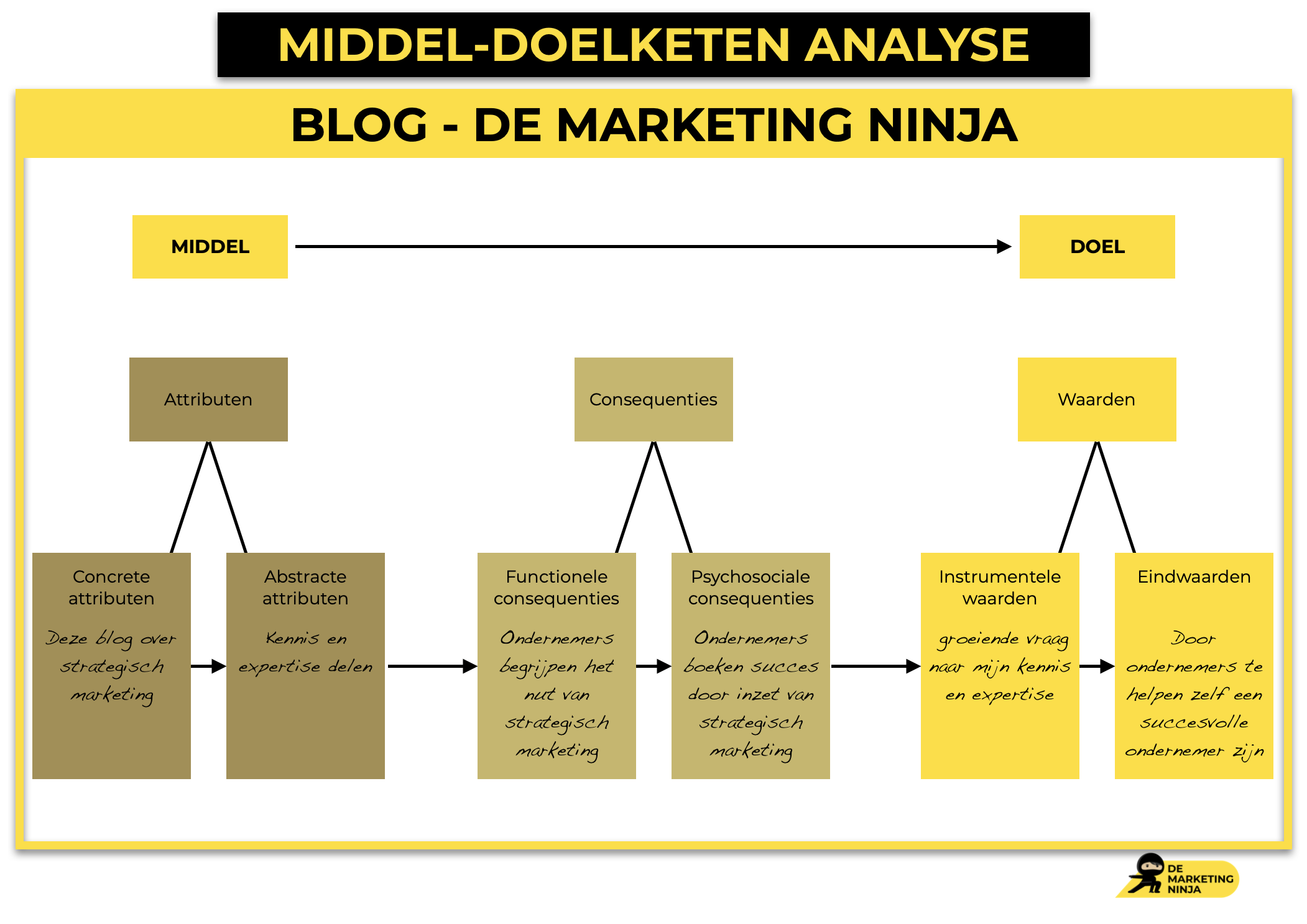 Het lijkt zo’n logisch vertrekpunt. Toch is het goed hier bij stil te staan. Vaak blijkt een doel een middel om een ander doel te bereiken. Door voor jezelf op te schrijven welke doelen je hebt, en jezelf steeds af te vragen ‘maar welk doel dient dit?‘ kun je afpellen tot het niveau van je werkelijke drijfveren. Een blog zoals deze heeft als eerste doel misschien kennis en expertise delen… maar er zit meer achter. Zie als voorbeeld de uitgewerkte Middel-Doelketen-analyse (zie afbeelding) gebaseerd op het ‘Means-end Chain Model’ van Gutman (1982). Hieruit blijkt dat mijn blog uiteindelijk slechts een middel is om op heel andere niveaus doelen te bereiken.