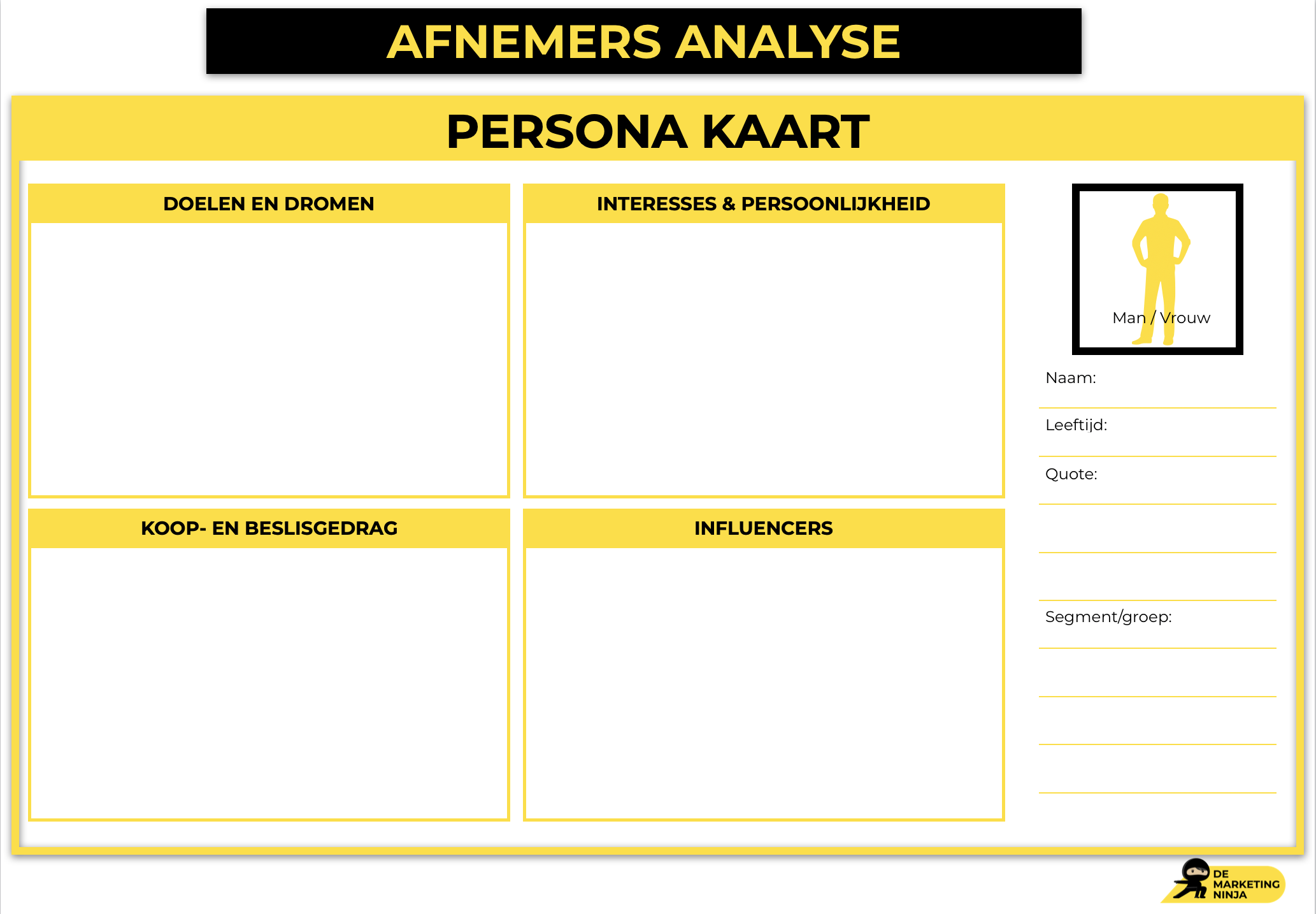 Tip: Zoek vijf tot tien mensen in je netwerk die je ideale klant zijn, en laat hen de Persona-kaart over zichzelf invullen. Waar zitten overeenkomsten en waar zitten verschillen met jouw ingevulde kaart? Nu je dit weet, kun je in je marketinguitingen iets aanscherpen? Je zult zien dat dit soort oefeningen je altijd iets leren over je klant.