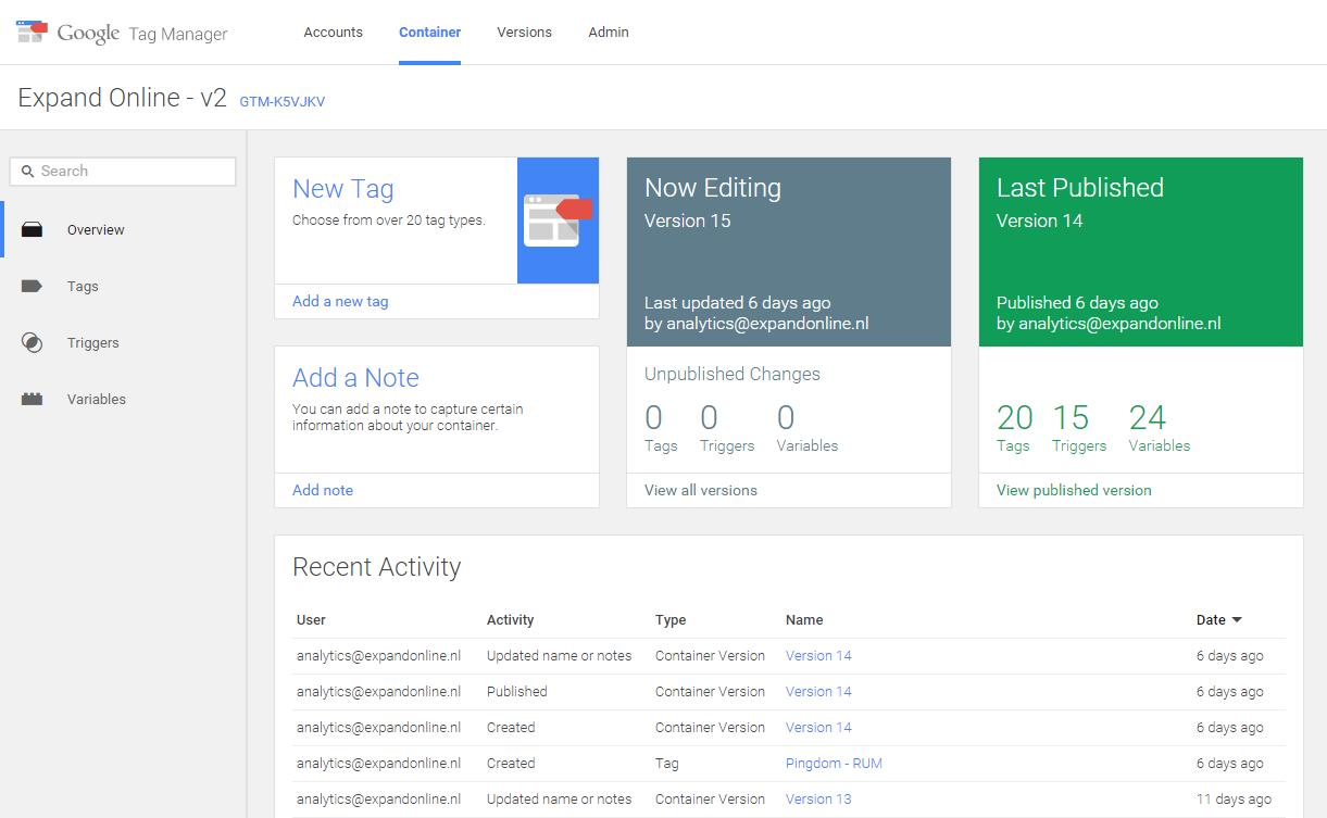 Vorige week kondigde Google aan dat ze op 1 juni alle bestaande Google Tag Manager-accounts zullen gaan upgraden naar versie 2. Vanaf die datum (of eerder, want je kunt nu al upgraden!) zul je Google Tag Manager niet meer herkennen. Wanneer je inlogt op tagmanager.google.com en doorklikt naar een container krijg je het volgende scherm te zien: