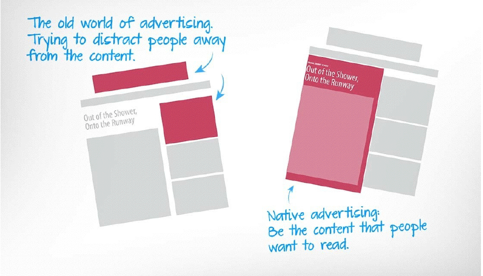 Bij de traditionele online reclame werd er vooral aan gewerkt de consument af te leiden van waar hij of zij op dat moment mee bezig was, maar door ‘native advertising’ toe te passen, lever je de content die mensen willen lezen. Denk bijvoorbeeld aan de Facebook Ads tegenover de gesponsorde berichten op Facebook. Ook kun je door het stellen van een paar vragen aan de klant erachter komen wat de klant zoekt en hem of haar vervolgens aan de hand meenemen door het beslissingsproces.