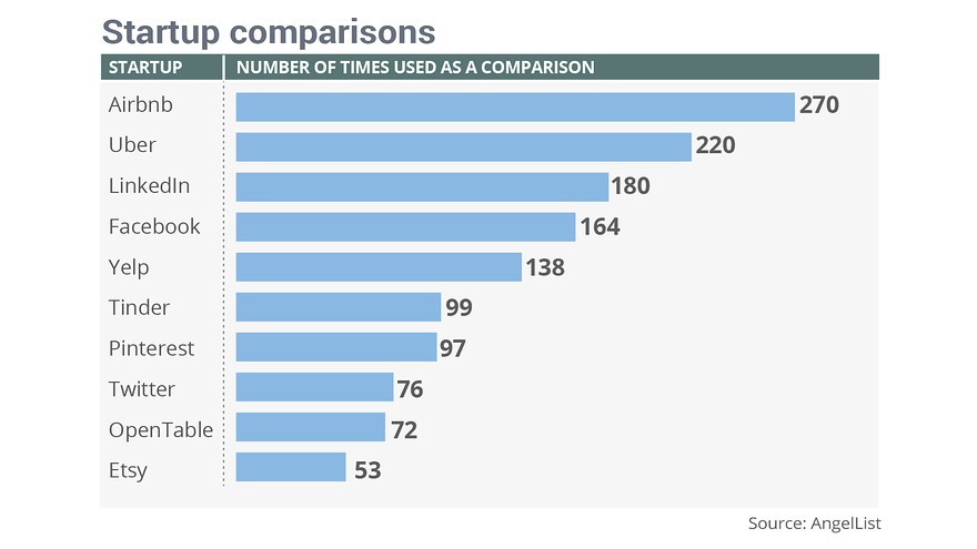 MarketWatch analyseerde 477.358 inzendingen van bedrijven op AngelList, 220.619 daarvan zijn actieve profielen. Airbnb was de meest populaire vergelijking van de bedrijven die zeggen dat ze de ‘Airbnb van …’ of de ‘Airbnb voor …’ zijn. Uber was de tweede meest populaire als een punt van vergelijking, en LinkedIn werd derde.