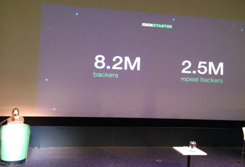Julie Wood (Kickstarter), Corinne Vigreux (TomTom), Angelique Plugge (ING), Anne van der Zwaag (Object Rotterdam), Marion van Happen (Secretary Plus) en Wanda Otto (PWC). Julie Wood van Kickstarter had een slideshow met interessante cijfers over Kickstarter. Tot nu toe heeft Kickstarter 81 duizend projecten gefinancierd. 1, 4 miljard euro is gevraagd door de starters. 8,2 miljoen mensen hebben een bijdrage (backers) geleverd en 2,5 miljoen zijn repeat backers, ze komen terug om te investeren in (andere) projecten.