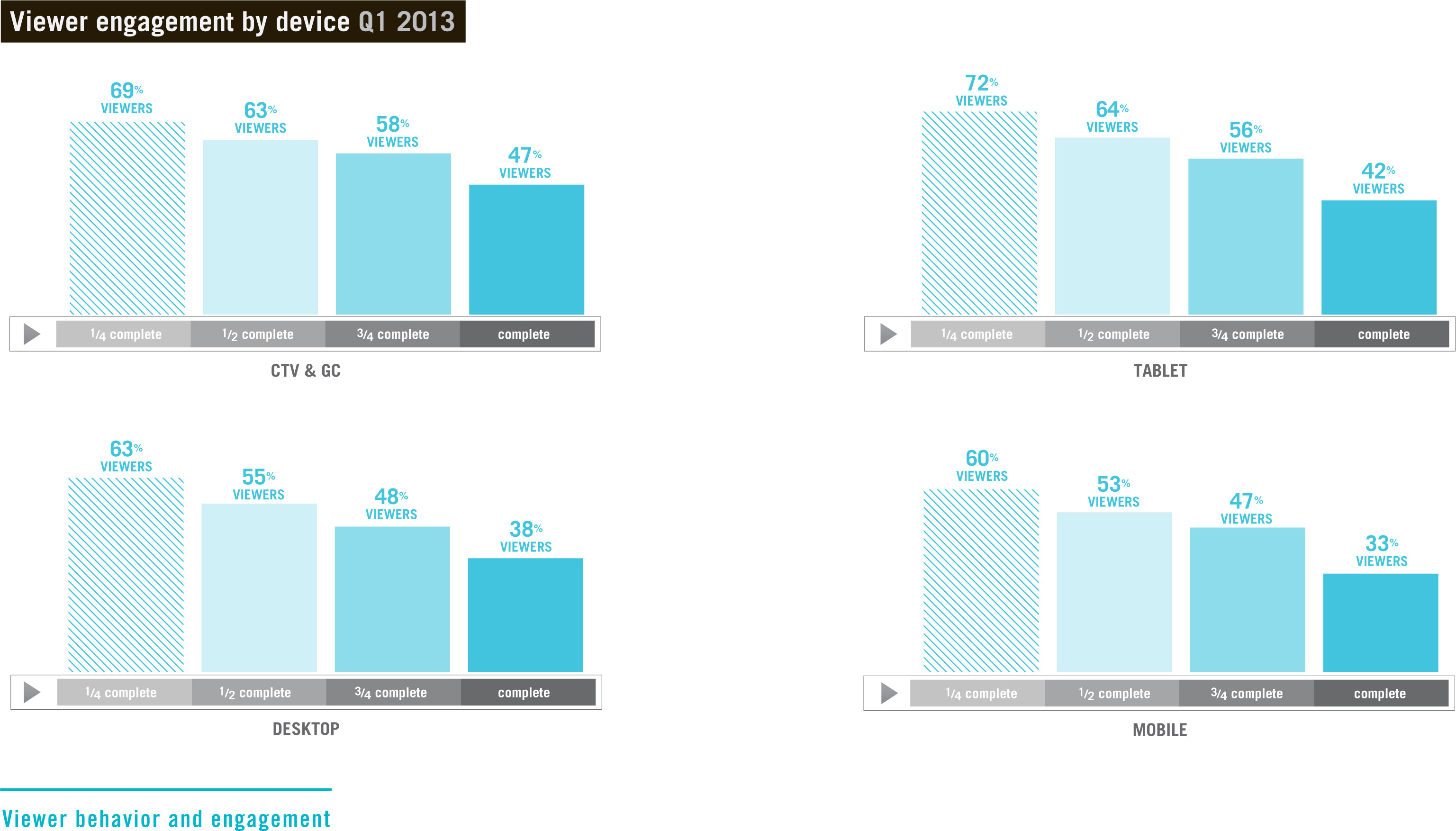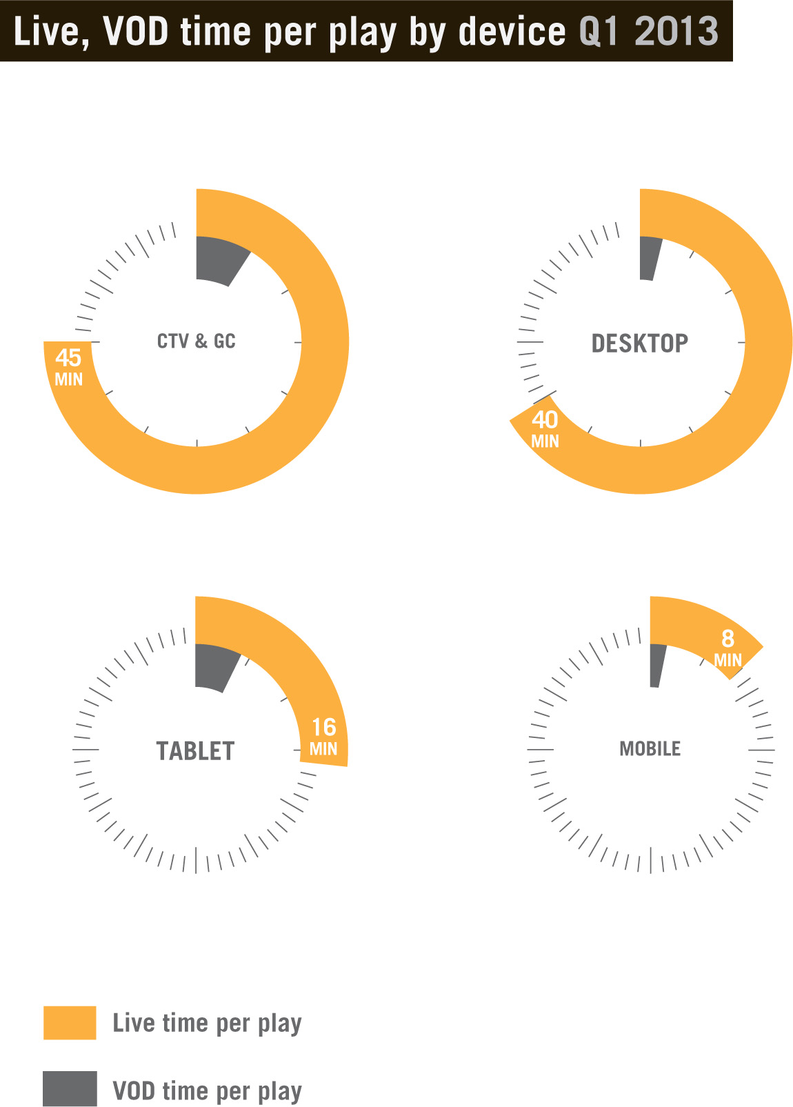 Uit de rapportage over het laatste kwartaal van 2012 bleek al dat live video op alle devices aanzienlijk meer wordt bekeken dan video on demand (VOD). Bijgaande illustraties laten zien dat die trend zich verder heeft doorgezet.