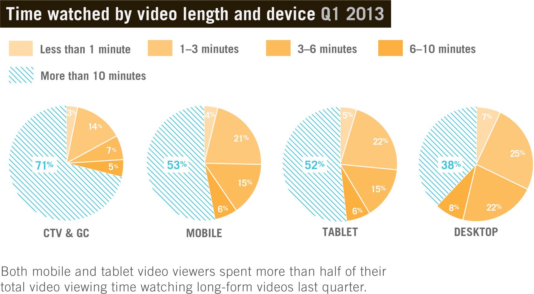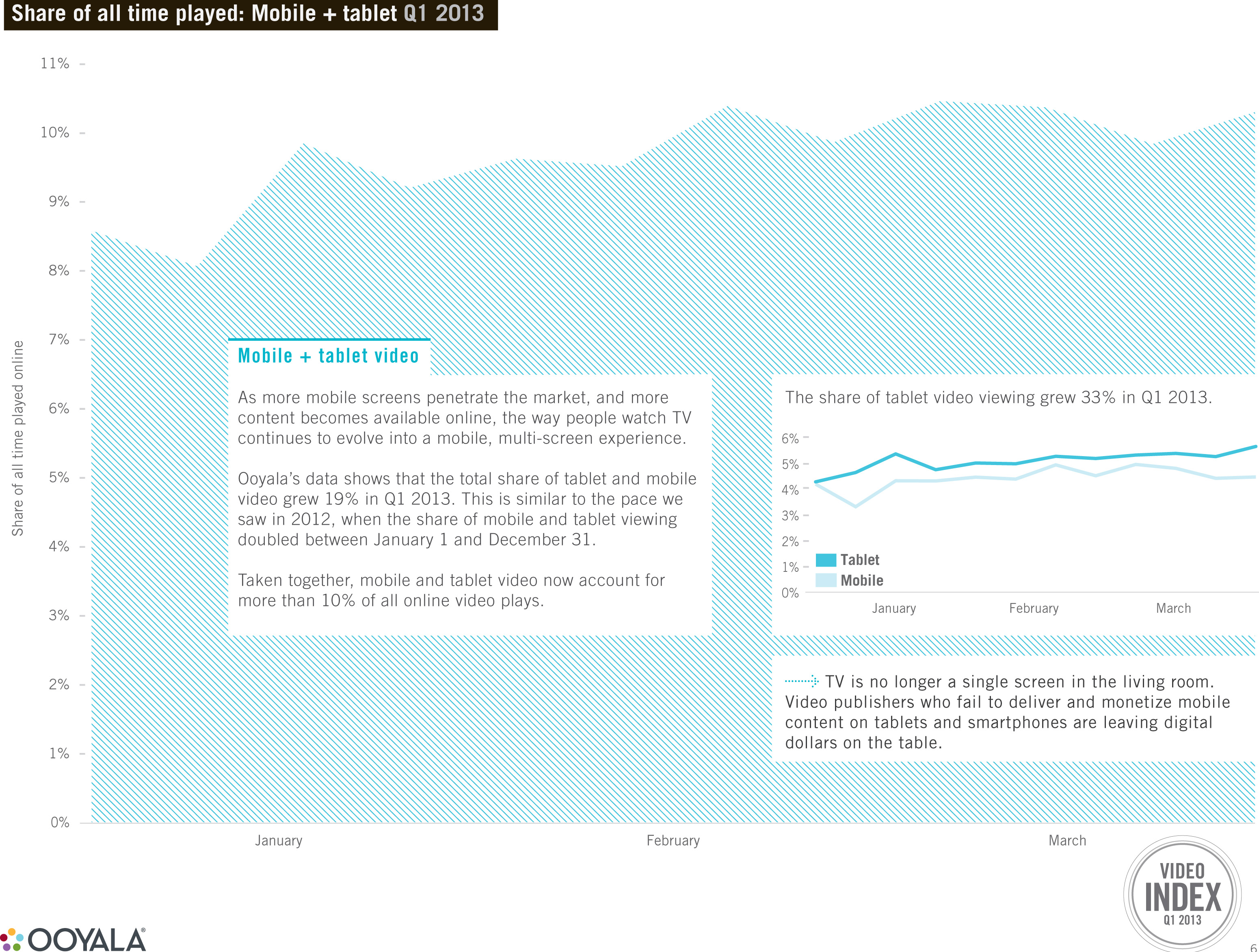 De mobiele videoconsumptie (zowel tablets als smartphones) is in het eerste kwartaal van dit jaar met 19 procent gegroeid en vertegenwoordigd daarmee voor het eerst meer dan 10 procent van de totale online videoconsumptie.