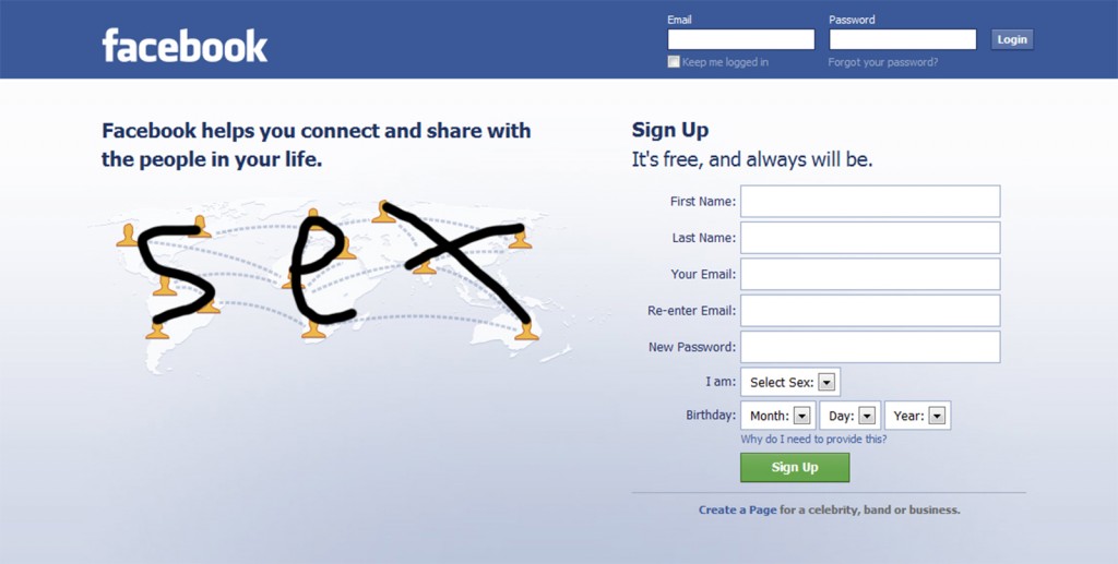 In eerste instantie vond ik dit ver gezocht, maar sociale netwerken zijn vooral bedoeld om in contact te komen met andere mensen. De vraag naar seks is daar een belangrijke motivatie voor. Het kan toeval zijn, maar het maakt het extra toevallig dat deze afbeelding bij de registratiepagina van Facebook stond. Precies op het punt waar je misschien twijfelt of je wel een account wilt aanmaken. Een kleine motivatie (dat je misschien wel eens seks zou kunnen krijgen) kan mensen over de streep trekken. Ik bedenk me opeens dat ik mijn vriendin heb leren kennen op Facebook.