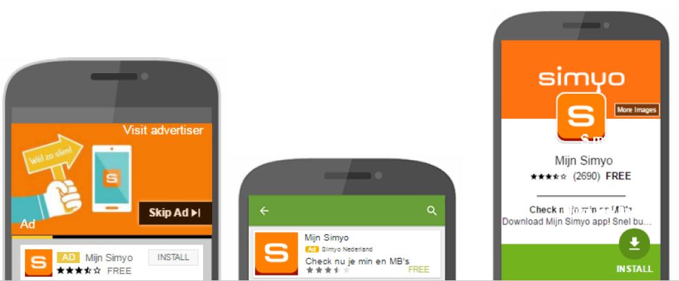 Voor wat betreft de advertentieteksten gebruikten we een mix van tekst-, display- en video-advertenties om de Simyo klant te bereiken in de appstore, in-app-display of op YouTube.