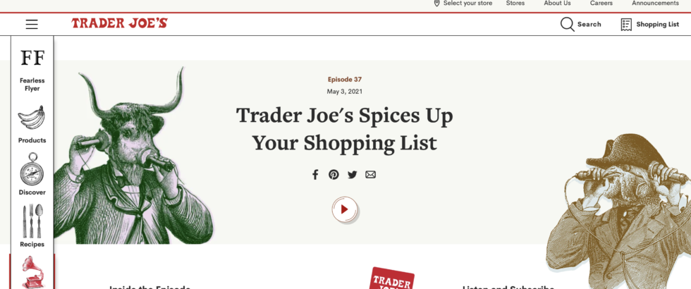 Airborne maakt iedere week een keuze voor de Podcast van de Week. De podcast van deze Week: Inside Trader Joe’s’ van Trader Joe’s. Trader Joe’s is een keten van buurtsupermarkten. Het onderscheidt zich door alle producten rechtstreeks bij de leverancier te kopen. In de podcast neemt Trader Joe’s de luisteraars mee in het gehele proces. Ze laten de verhalen horen achter de producten. En laat dat nu juist prima aansluiten bij de interesse van de luisteraars die op zoek zijn naar verhalen over de liefde voor eten en de natuur. Luister de podcast van de week hier.