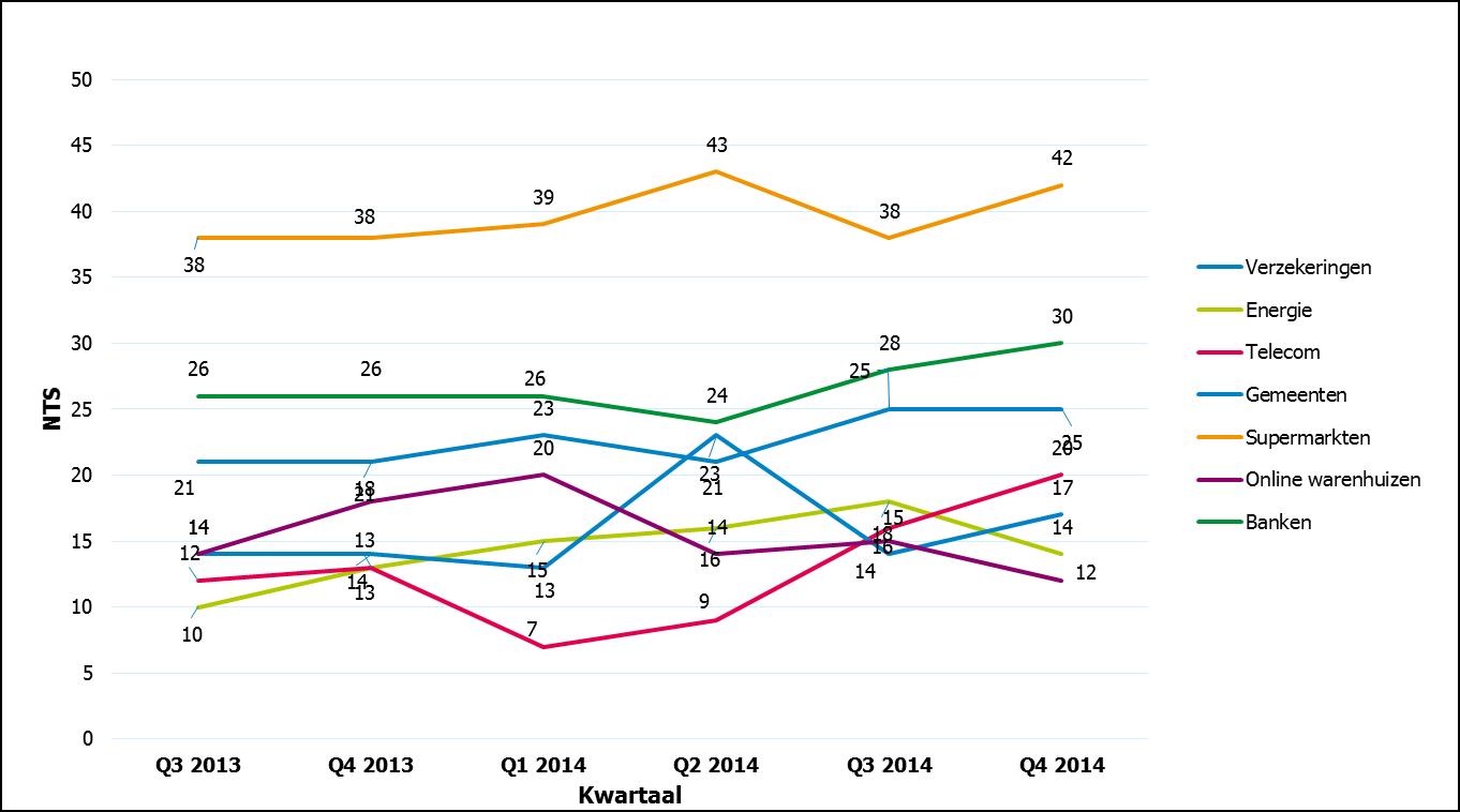 Supermarkten scoren het hoogst. Al eerder hebben we hier geconstateerd dat het ook vaak supermarktketens zijn die hoog scoren in competities als het klantvriendelijkste bedrijf van Nederland. De concurrentie is dermate groot, dat men alles uit de kast haalt om in de gunst van klanten te blijven.