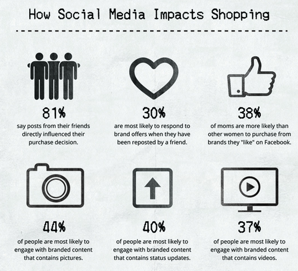 In onderstaand gedeelte uit een infographic van Bigcommerce zie je dat maar liefst 81 procent van de socialmedia-gebruikers aangeeft dat updates van vrienden direct invloed hebben op hun koopgedrag. Je wilt jouw klanten hun ervaring dus online en uiteraard ook offline laten delen.